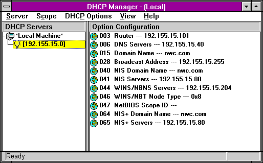In fact, the lack of integration with anything was one of the more annoying aspects of the product. We could not manage it from NDS or from UNICON, or anywhere except the standalone DHCPCFG.NLM program. While this tool offers a fairly good interface, it is a long way from complete. For example, we couldn't add any new DHCP options to the configuration, and we were limited to the options presented. This made it impossible to add elements such as NIS domains and servers, or to edit any of the normal advanced options, such as NTP server.