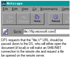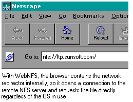 SunSoft realizes that Microsoft has the advantage in being able to support CIFS technology directly in their OS, and is suggesting that vendors embed WebNFS in their products directly, thereby making Microsoft's advantage irrelevant. Rather than attempt to get WebNFS installed on all of the PCs in existence, SunSoft is pushing to have WebNFS embedded directly into browsers. Among the vendors backing this effort is Netscape, who will be embedding WebNFS directly into Navigator. When a user clicks on a NFS:// URL, Navigator will make the NFS connection directly, avoiding the underlying OS' network technologies completely.