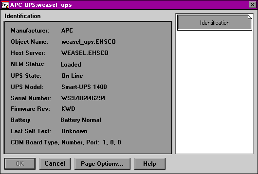Disconnecting the UPS from the power outlet caused an alert to be generated by the NLM, which was reflected by the snap-in almost immediately. However, the information presented in the snap-in is currently read-only, so you can't configure the UPS from within NWADMIN. Support for configuration through the snap-in is expected in a future release.
