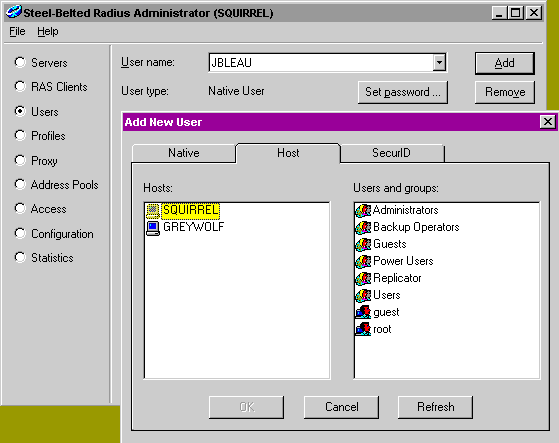 Steel-Belted Radius for Windows NT provides RADIUS authentication against NT domains, workgroups, or host-specific user account databases, conveniently allowing remote-access users to use the same user name and password on the dial-up network as they do on the local network.