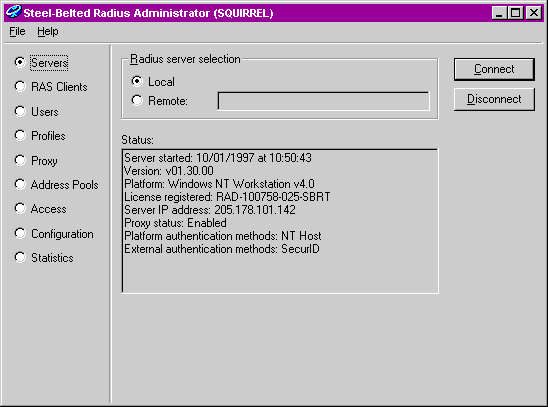All of Steel-Belted RADIUS' administration is handled through a stand-alone, 32-bit Windows application. The administration tool allows you to manage multiple Steel-Belted RADIUS servers independently from a single application. You can also import and export definitions across multiple servers from within the administrative application.