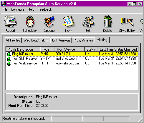 The most compelling addition to WebTrends 2.0 is the new network monitor cartridge. This module allows you to automate a set of network tests, verifying that Web, mail, domain name service, and other servers are up and running. You can then define a set of actions to take based on a service's availability, such as sending a page or e-mail message.