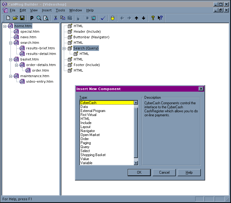 Cat@log 2.5 also includes a variety of integrated payment objects. Among those directly supported are CyberCash, First Virtual, Open Market, and VeriFone. Cat@log also provides a generic "external" object that can be used to reference an external application, allowing Cat@log Manager to call another billing service, e-mail client, a faxing program, or any other program.