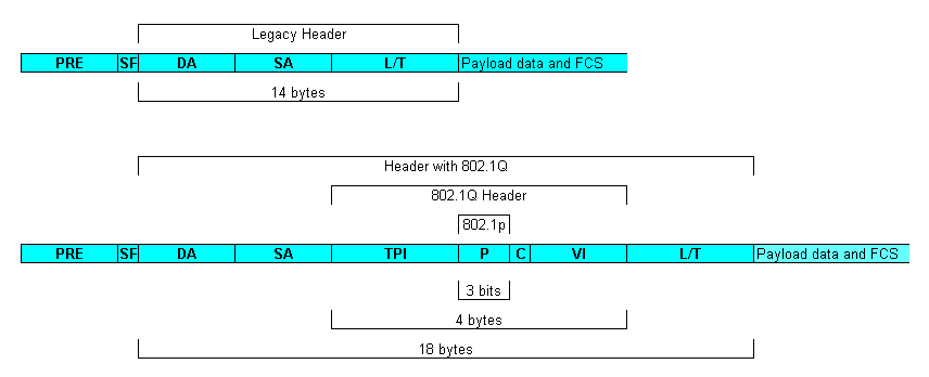 Implementation of 802.1Q is through an additional 4 bytes of data inserted into a frame's header. These 4 bytes contain a variety of fields, most of which are specific to VLAN data, although one field also provides a 3-bit priority flag. These 3 bits provide eight possible values, the same as those used in the 802.1p priority-mapping scheme. On Ethernet networks, the 802.1Q header fields are inserted into a frame's header immediately following the source and destination address fields and before the 802.3 "length" (or the Ethernet II "ethertype") field.