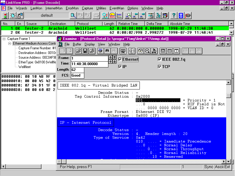 LinkView Pro also has a protocol capture and decode service, although it isn't very robust. For detailed analysis, you need the WG Examine add-on decoder. With WG Examine, I could capture 802.1Q frames (a new IEEE specification for virtual LANs) and look at their contents. However, LinkView Pro's native decoder saw these packets as "Wellfleet" frames (802.1Q frames look like "Ethertype 8100," the old Wellfleet Ethertype).