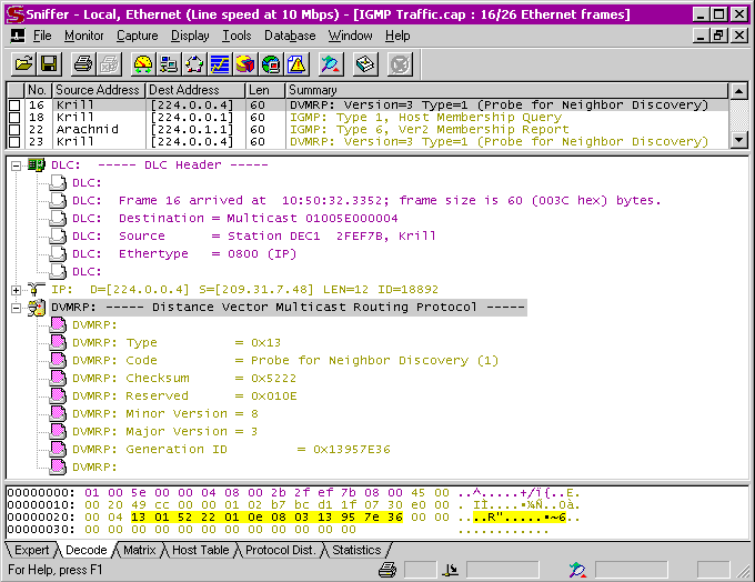 In addition, multicast routers will periodically issue surveys for active group memberships. If no hosts respond to the membership query, the multicast router can assume that no end stations on that particular network want that traffic, preserving even more bandwidth. For example, the screen at left shows a multicast router on Krill, running DVMRP (Distance Vector Multicast Routing Protocol), issuing a membership query for the local network, as well as the NTP server on Arachnid responding with a membership report.