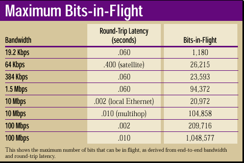 For example, when you multiply the throughput of a 19.2-Kbps modem (19.2 x 1,024 bits) by an average round-trip time of 60 milliseconds (.06 seconds), the maximum amount of in-flight data on the network is approximately 1,180 bits (rounded up from 1,179.648 bits). For additional examples of this formula at work, see "Maximum Bits-in-Flight" below. Note that this formula only tells us how many bits can be in flight at any given time and does not tell us the optimal window size.