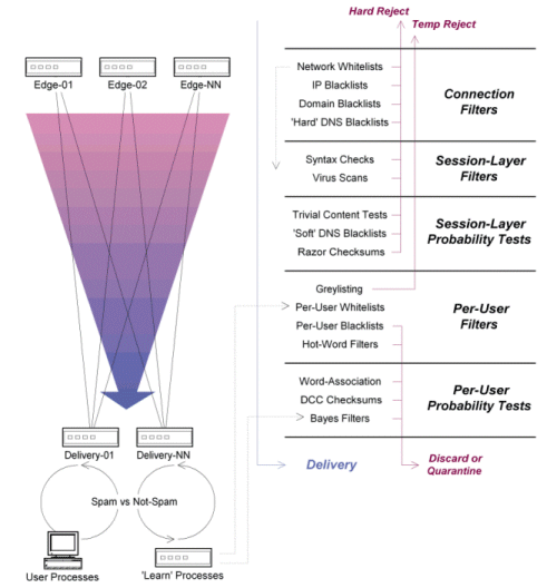 Mixing and matching a variety of different mechanisms offers the best protection, while still preserving a reasonable cost savings. In this kind of model, edge filters can be deployed that simply reject obvious junk mail, while additional filtering mechanisms can operate inside the messaging network that reflect user-specific requirements. These kinds of layered installations offer the highest actual prevention against junk mail since they can be molded to specific characteristics without triggering an excessive number of false positives, while the elimination of obvious spam at the edge means that fewer actual resources are needed to process the reduced number of messages at the final point of delivery.