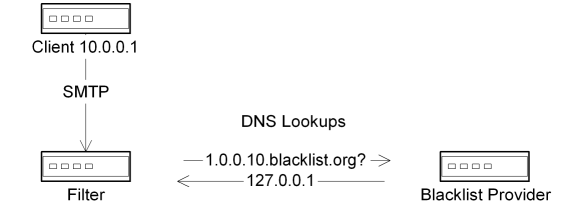 In general, it's a good idea to make limited use of a small and highly-trusted subset of these lookup services, but not to use too many of them. In particular, performing one or two lookups against a couple of good blacklists can eliminate large numbers of incoming spam from your network, and this one step is likely to free up significant amounts of network resources for additional filtering processes. And even if you are unable to use these filters to completely reject incoming email, you can use some of the blacklists for delayed probability tests, such as having SpamAssassin call on the blacklists instead of having your SMTP client do it alone (or in conjunction with the SMTP server, as is demonstrated in Figure 1). In that kind of model, the junk mail that isn't killed by the local filters can still be eliminated by the secondary tests before the messages reach the internal servers.