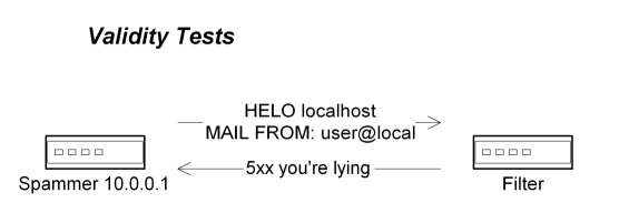 Another fairly recent trend in the fight against junk mail is the increasing use of protocol validity tests, which attempt to determine if a particular sender or message conforms to well-known practices. These tests can be extremely effective in keeping spam off your network entirely, but because of their dependence on letter-of-the-law conformance, they can also generate a tremendous number of false-positives, and must therefore be deployed judiciously and prudently. In the general case, they are best used for determining probabilities rather than flatly rejecting incoming mail.
