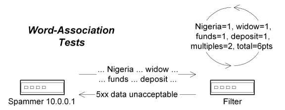 Along the same lines, most SMTP servers also support basic filters for prohibited strings in the message body itself, such as looking for telltale markers of Nigerian scams, investment services, health products and the like. However, these offerings are frequently camouflaged through the use of noise text, or by misspelling key words, and as such you really need to use probabilistic tools that look for these markers in conjunction with the original hot-word filters. This is the area where SpamAssassin shines the most, since it is provided with hundreds of such tests, and with dozens more being freely available from third-party contributors. Through the judicial use of these basic word-association filters, it is possible to catch high-probability spam at the edge of the network, and with relatively low levels of computational overhead in comparison to the high reward.