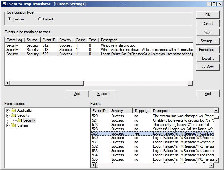 Some events simply cannot be trapped in the Windows event log without the use of external tools. For example, programs that write event data to their own specific logfile and don't use the Windows event system cannot be integrated with SNMP traps unless you use a third-party tool to stuff the logfile entries into the event log, while open source applications that have been ported to Windows often rely on a "syslog" interface that may require a local proxy. Even in these cases, however, you still may not be able to trap individual events, with the overall functionality being dependant upon whether or not the external program is able to generate discrete system events for different kinds of entries.