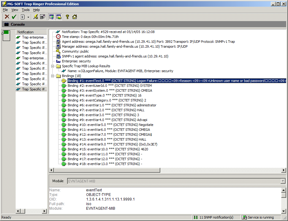 The SNMP trap data itself is provided as an enterprise-specific alert, using the OID value of 9999 after the base OID value described above. Every trap message has at least five sub-fields, while some of them can provide a dozen or more additional event-specific variables. The five fields that are always present are the textual event message, the user ID of the process that triggered the event, the computer name of the event system, a numeric representation of the event "type", and a numeric representation of the event "category", in that order. We have named these as "eventText", "eventUserId", "eventSystem", "eventType" and "eventCategory" respectively in our sample MIB.