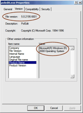 If you're not sure which version of poledit.exe you have, you can look at the file properties in Explorer and examine the information in the "Versions" tab. Figure 2 shows the version information for the poledit.exe that is included in Windows 2000 SP4.