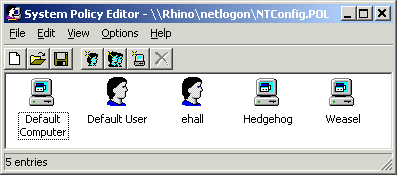 Figure 3 shows a policy database with target-specific definitions for the user with the account name of "ehall" and a pair of PCs with the workstation name of "hedgehog" and "weasel" respectively. The machine-specific settings will apply to any user on those workstations, while the user-specific settings will apply to the ehall user account regardless of his current location. In both cases, the machine and user account will also inherit whatever settings have been applied to the default targets.