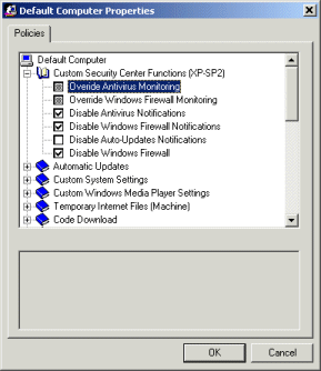 The policy definitions are set by double-clicking on one of the defined targets, and then manipulating the state of each individual policy for that target. Each policy is in a "neutral" state by default, where the policy statement is essentially ignored. The policy state must be explicitly defined before any changes will be made. The current state of a policy is represented with a simple checkbox next to the policy name; a neutral policy has a grey checkbox, while an enabled policy has a mark in the checkbox, and a disabled policy has a completely empty checkbox. If a policy has any extended settings (like textual data or flags), the input boxes associated with those policies will also be disabled until the policy itself is activated. Policies which have been explicitly disabled usually have their own associated value (such as setting a a registry key to "0" instead of "1"), and will sometimes cause the extended entry data to be cleared or reset, but this will not always be the case.