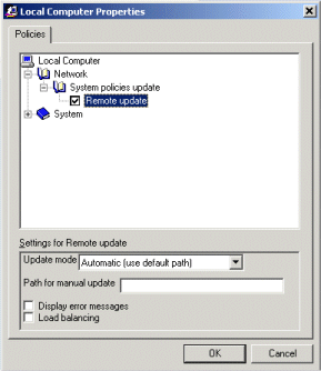 If you do not have a NT domain, or if you have PCs that are not part of a domain, you can also instruct the clients to load a centralized policy database by modifying their local registries. HKEY_LOCAL_MACHINE\System\CurrentControlSet\Control\Update will need to have an entry for "UpdateMode" with the DWORD value of "2", and an entry for "NetworkPath" with the STRING value containing a path to the database file.