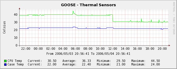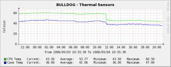 The next chart shows the same kind of change on my remote Web server: Before the tweak, the idle temperature was around 40 degrees Celsius (thanks to the industrial AC), but dropped to below 30 afterwards.