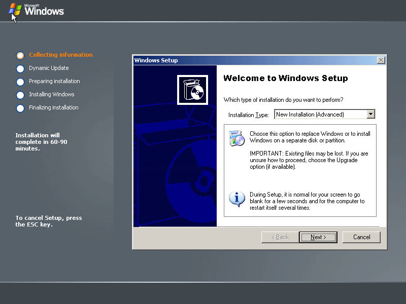 At this point you should have a directory called $WIN_NT$.~BT in the root of your C: drive, along with some other files that would normally be used by setup when the system rebooted. We need to grab some of these files, and also some of the files from the installation media, and then delete whatever leftover junk remains.