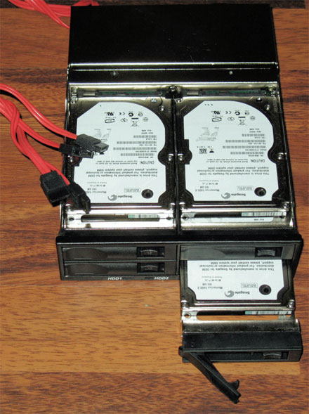 For my testing, Enhance Technology sent one of its QuadraPack Q14 cages with internal and external SATA connectors. Fujitsu sent four of its MHV2040BH SATA drives, and Seagate sent four of its brand-new ST9160821AS SATA drives.