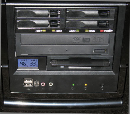 The drives and carrier were installed in two different systems: a basic rack-mount system for performance testing, and a small-form-factor micro ATX chassis for general usability testing. The latter (shown below) is used for general-purpose file-and-print sharing and some common Internet applications, and only had a single exposed 5.25" drive bay remaining. The combination of the Q14 drive cage and the four SATA drives proved to be an excellent match for both systems, due to the space restrictions in the chassis.
