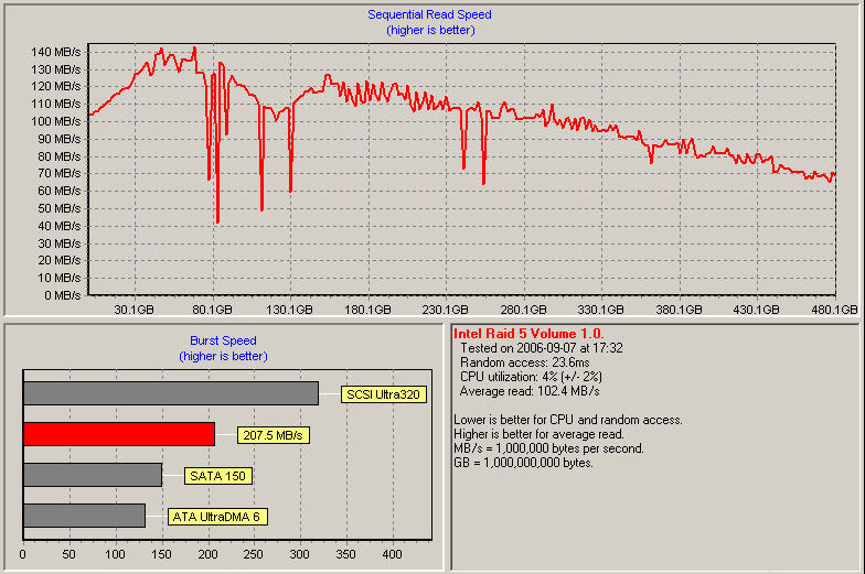 The absolute best throughput numbers came from using HD Tach read tests, with the Seagate drives on the ICH7-R in a RAID-5 array with 64 KB strips, which peaked at just over 140 MB/s with an average of 102.4 MB/s and a burst rate of 207.5 MB/s (see the screen shot below). The 9550SX in the same configuration yielded peak transfers of over 130 MB/s with an average of 99.8 MB/s, and a burst rate of 194.4 MB/s.
