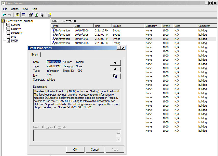 Once the data is generated, you also need a client-side DLL for Event Viewer to know how to parse the event data. Otherwise you end up with "The description for Event ID (1000) in Source (Syslog) cannot be found" errors tagged to all the entries; you can see this output in the screenshot above. All in all, this solution is really more of a starting point than anything, but it still quite useful, and much easier for Windows administrators to use than traditional UNIX logfile tools.