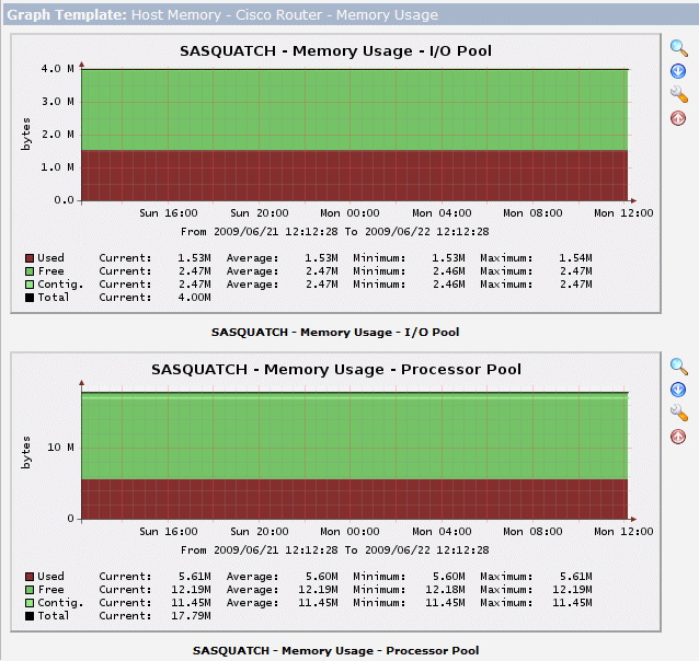 In order to accurately capture that information in Cacti, this snmp template enumerates each of the router memory pools, determines the memory pool name, and then captures the readings for each selected memory pool. For illustration purposes, the sample graphs below show the memory usage for a small router with two distinct memory pools.