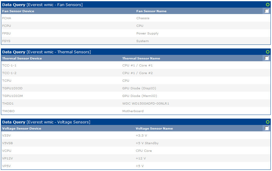 - Once the screen finishes loading, locate the "Everest wmic - Fan Sensors" data query, which should be similar to the figure at right. Select the sensors that you want to monitor, and click the "Create" button at the bottom of the screen to include them in the polling process. Repeat this process for the Thermal and Voltage data queries as desired.