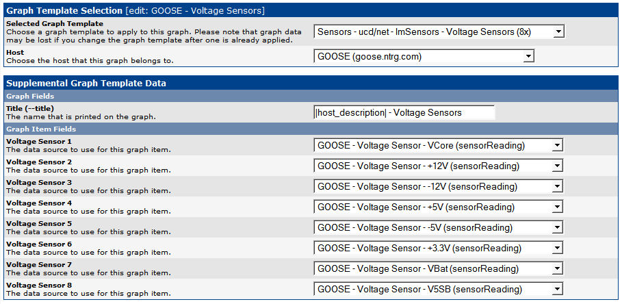The process described above will result in each sensor device having its own graph. If you would like to consolidate multiple sensors of a specific type into a single graph, the tarfile includes graph templates that can be used to consolidate readings from multiple data sources, although some editing will likely be required. To use these graph templates, perform the following steps: