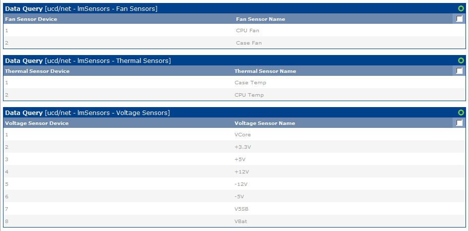 - Click on the "Data Queries" menu item on the left side of the Console screen and verify that a "ucd/net - lmSensors - Fan Sensors" data query is present. Click the name of the object and verify that Cacti was able to locate and read the XML resource file. Repeat this process for the Thermal and Voltage data queries.