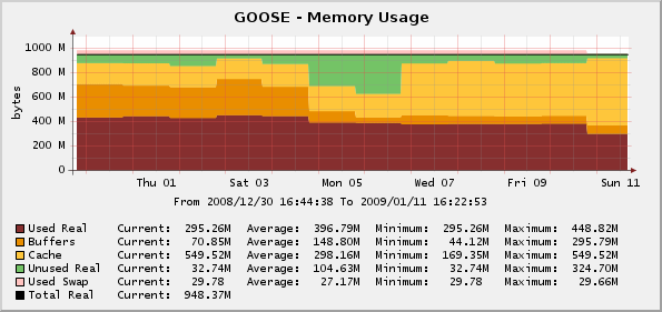 This script template is intended to overcome these shortcomings by fetching all of the available memory data from all known sources (including the standard HOST MIB), and then performing basic arithmetic to fill in any gaps in the data. For illustration purposes, the sample graph below shows the memory usage for a Linux host with 1 gigabyte of RAM. In that chart, the amount of real memory that is available to the system is displayed along with the amount of memory that has been reserved for processes ("used real"), the amount that has been allocated for buffers and disk caching, the amount that has not been allocated ("unused real"), and the amount of swap space that is currently in use. Note that this is the full and complete set of data, and some operating systems may provide much less data to the relevant SNMP MIBs.