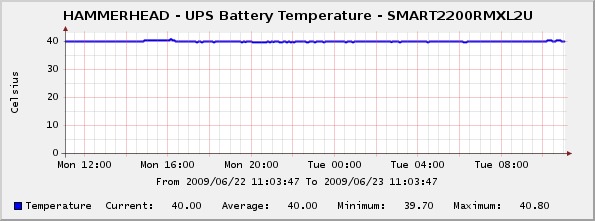 For illustration purposes, the graphs in the figures at right show the "Power Input" graphs for a Windows 2003 server running PowerAlert 12.04 communicating with an MGE Pulsar Evolution 1100 and a Tripp-Lite SMART2200RMXL2U via local USB interfaces, while the additional pair of graphs below show the "Load Capacity" output for the same two devices, and a separate graph shows the battery temperature for the Tripp-Lite UPS. I also use these same tools to monitor the same data on a variety of APC ES 650 and 750 UPS devices that serve the individual desktop systems. However, PowerAlert does not provide all of the data from all of the UPS devices—of the three UPS brands I have in use here, PowerAlert only displays the full set of data for the Tripp-Lite UPS.