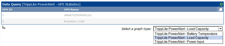 - Once the screen finishes loading, locate the "TrippLite PowerAlert - UPS Statistics" data query, which should be similar to the figure at right. At the bottom right of the list is a drop-down box containing three available graph types for the data query. Select the graph type that you want to generate, then select the UPS device(s) that you want to monitor, and then click the "create" button at the bottom of the screen to include the required data in the poller process. If you wish to create multiple graphs for multiple devices, you will need to repeat this process for each graph type.