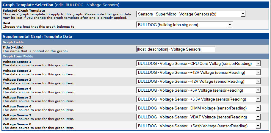 Specifically, the Supermicro sensors are stored in a single shared SNMP table, with each sensor having a "type" code that indicates the kind of sensor it represents (ie, a Fan, or a temperature probe, or a voltage sensor). In order to integrate these sensors into Cacti in a meaningful way, this script template uses a script that separates the sensors according to their type, and then presents those sensors to the user separately.