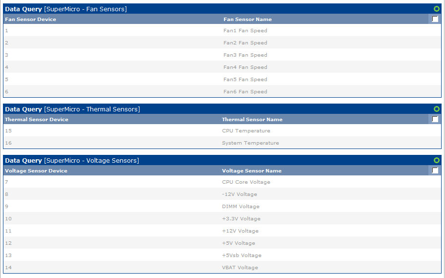 - Once the screen finishes loading, locate the "Supermicro - Fan Sensors" data query, which should be similar to the figure at right. Select the sensors that you want to monitor, and click the "Create" button at the bottom of the screen to include them in the polling process. Repeat this process for the Thermal and Voltage data queries as desired.