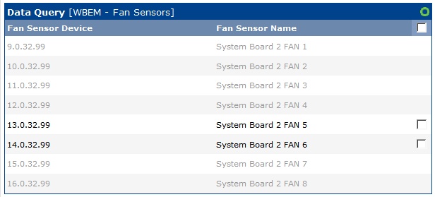 - Once the screen finishes loading, locate the "WBEM Fan Sensors" data query, which should be similar to the figure at right. Select the sensors that you want to monitor, and click the "Create" button at the bottom of the screen to include them in the polling process. Repeat this process for the Thermal and Voltage data queries as desired.